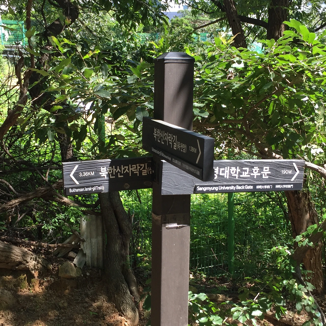이정표가 안 보여 진입로 찾기에 애를 먹었다. 택배 기사님께 물어보았으나 실패했다. 다음 지도 앱을 켰다. 탐방 내내 많은 도움을 받았다. 상명대학교 제1공학관과 학생회관 사이를 통과하고, 부속중학교 정문 좌측 샛길로 접어들어 약 50m 더 올라가 진입로를 찾았다.