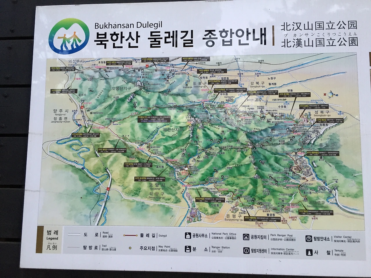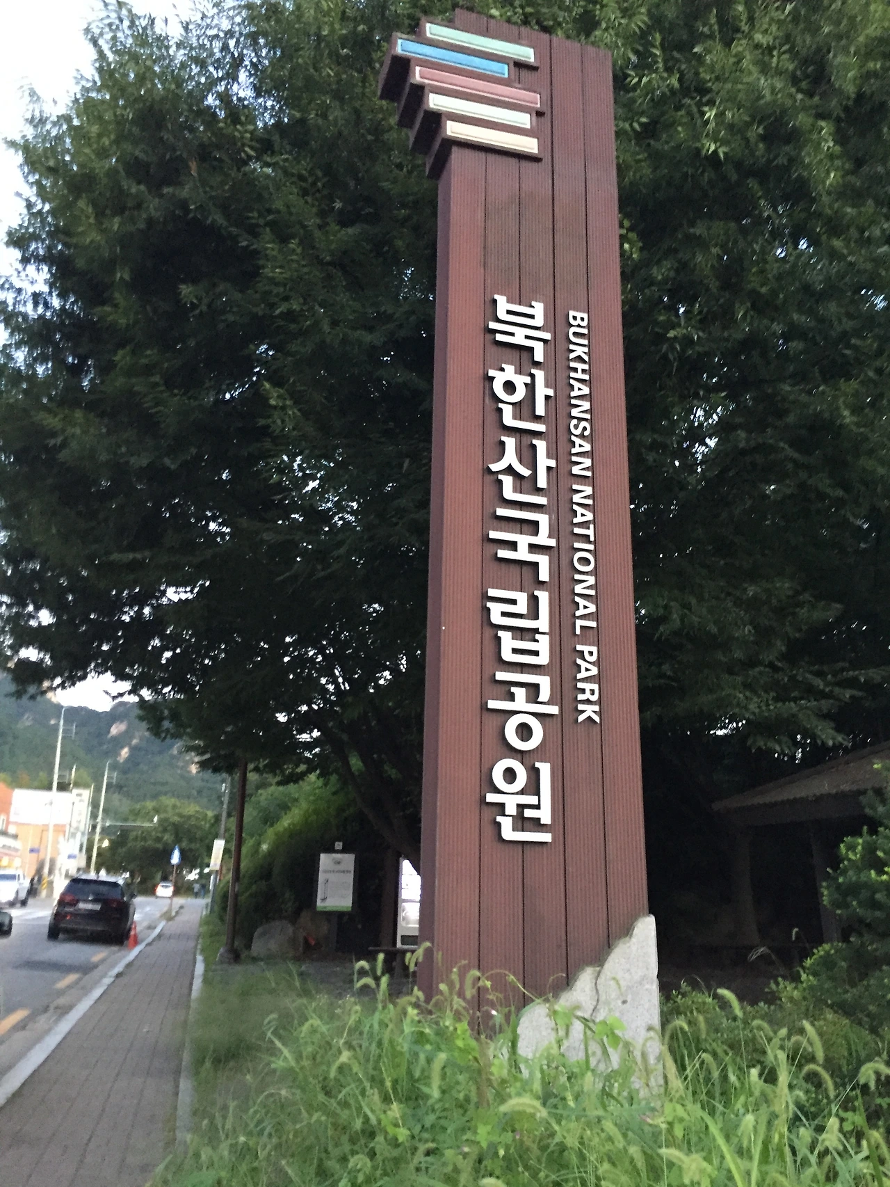 '북한산국립공원' 간판이 북한산성처럼 우뚝 서 있다. 북한산성 계곡 물소리를 듣고, 음이온과 많이 접촉하며 내려와서 인지, 다리는 아프지만 기분이 상쾌하다.