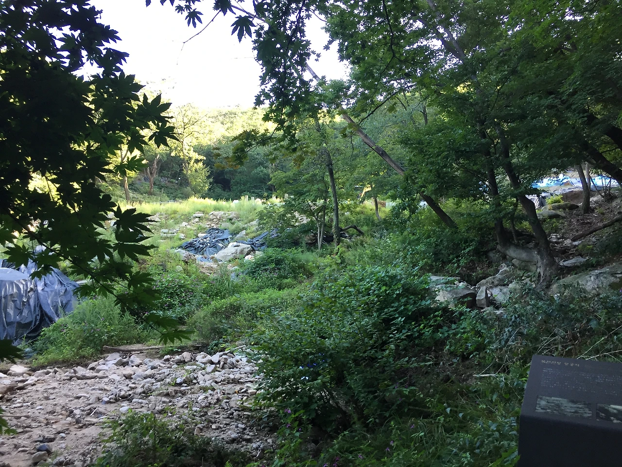 드디어 어렴풋이 행궁지 모습이 보인다. 그런데 가까이 내려가 보니 로프 줄이 쳐져있다. 행궁지 곳곳에 푸른 천막으로 뭔가를 덮어 놓았다. 문화재 발굴조사구역이므로 ‘관계자 외 출입금지‘다. 아무튼 오늘 목표는 성공적으로 달성한 셈이다. 주위에 경리청상창지 남장대지 금위영 이건기비 금위영 유영지 어영청 유영지(대성암)가 있다.