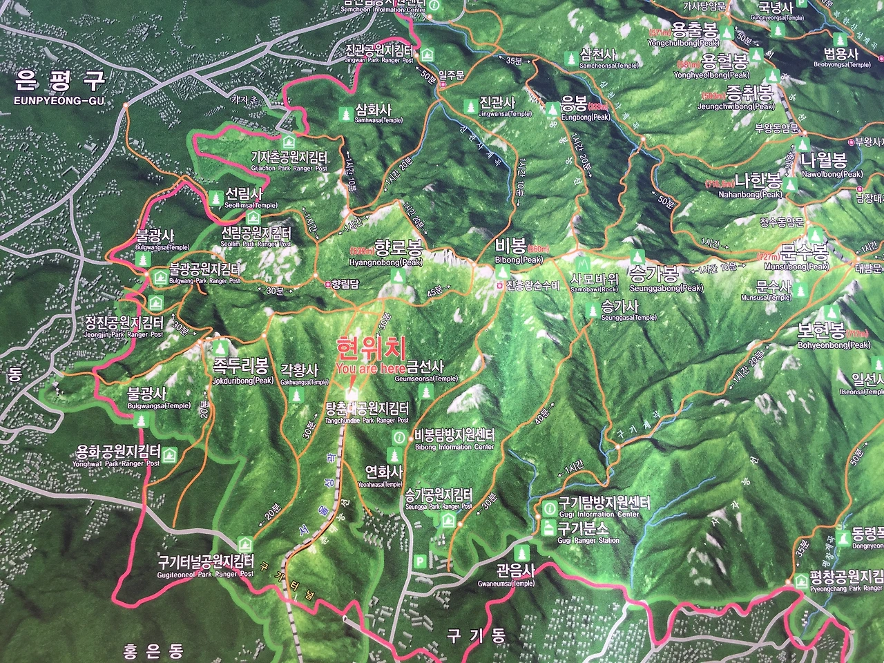 북한산 둘레길 종합안내판이 있다. 대형 소방차를 끌고 올라온 119 구급대원 5명이 표지판 앞에서 뭔가를 열심히 찾고 있었다.
