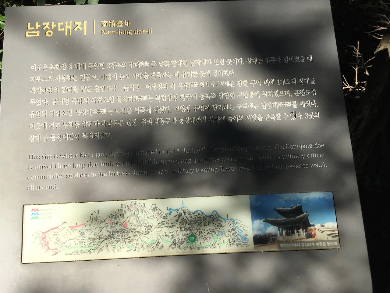 북한산성 3개 장대중 남쪽 장대이다. 전투 시 지휘소 역할을 하며 사방을 관측하기에 좋은 곳에 설치했다.