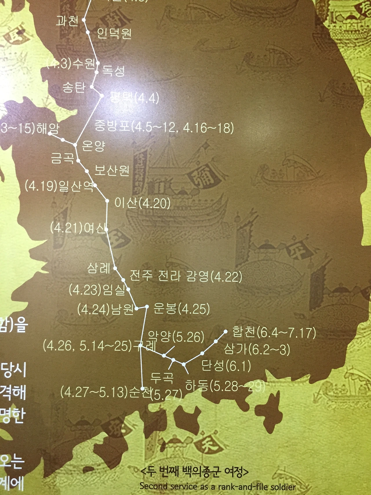 『난중일기』에 따르면 백의종군 주요 이동경로는 아래와 같다.
