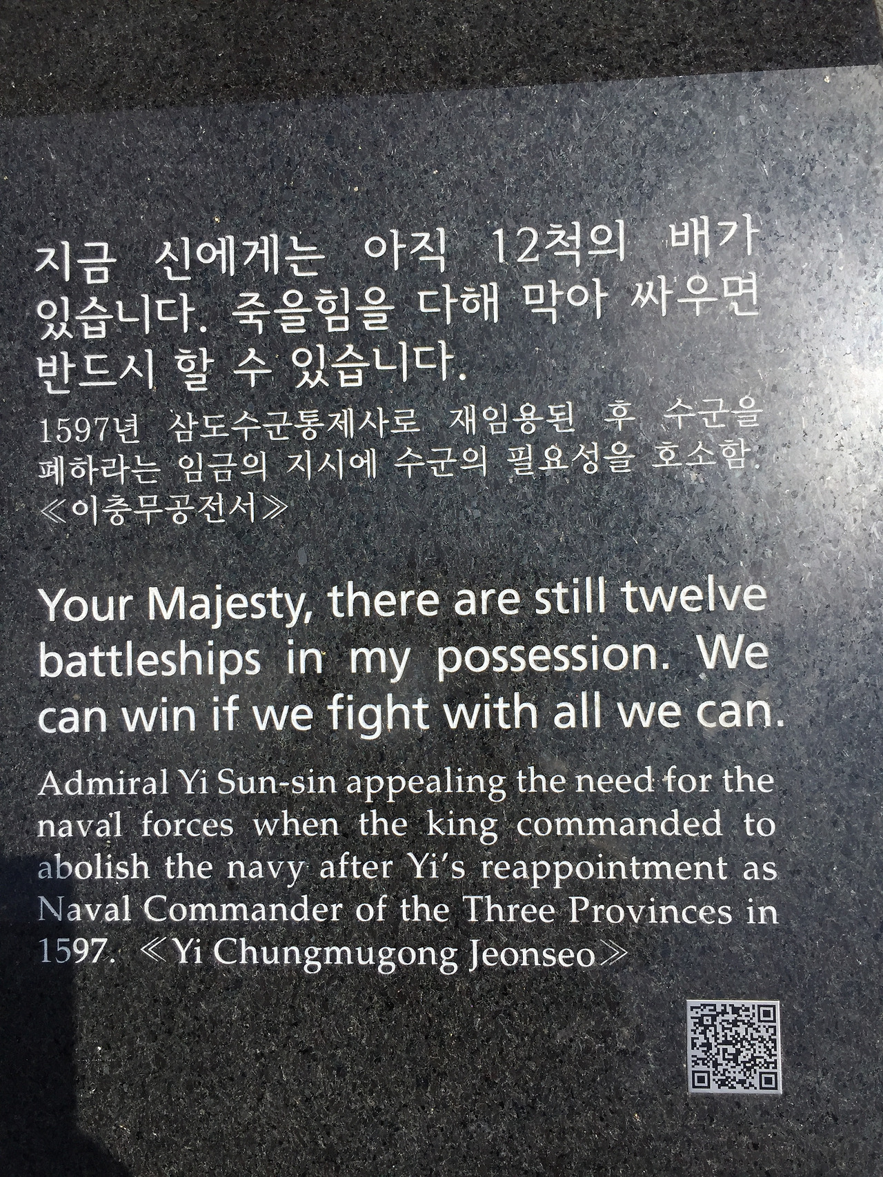 9월 15일 :우수영 앞바다로 진을 옮겼다. 벽파정 뒤에 명량이 있는데 수가 적은 수군이 명량을 등지고 진을 칠 수는 없기 때문이다. 여러 장수들을 불러 모아 약속했다. 병법에 이르기를 반드시 죽고자 하면 살고 반드시 살고자 하면 죽는다.(必死則生, 必生則死). 한사나이가 길목을 지키면 천명도 두렵게 할 수 있다고 훈시했다. 조금이라도 군율을 어기면 용서하지 않을 것이다라고 경고하였다.