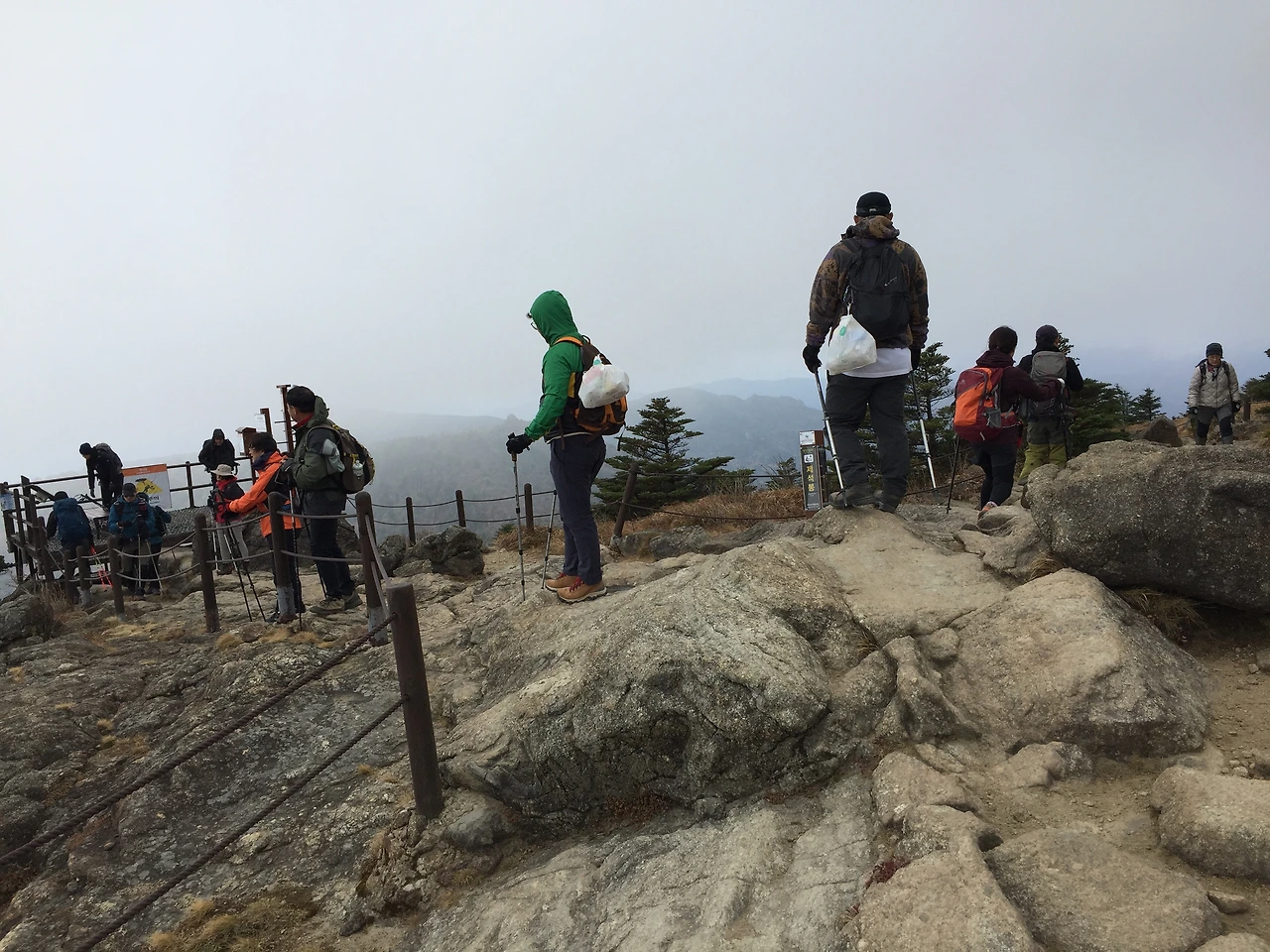 정상석이 있는 곳의 바람소리는 겨울 북풍 소리다. 갑자기 어느 등산객의 모자가 강풍에 벗겨져서 계곡 아래로 날아갔다. 머리 위에는 수리 한 마리가 구름 속을 빙빙 회전하며 돌아다녔다. 영화의 한 장면 같은 신비한 선경이 연출되었다. 정상 샷 촬영을 위해 추위에 떨며 20여분 줄을 서야 했다. 그야말로 장사진이었다. 법계사 방향에서 올라온 등산 동호회원 이십여 명이 합류하여 좁은 정상석 기념사진 촬영 장소는 그야말로 인기 절정 잔칫집 분위기였다. 정상은 급격한 기온 하강으로 모두들 움추러 들었다. 오래 머무를 수가 없었다.