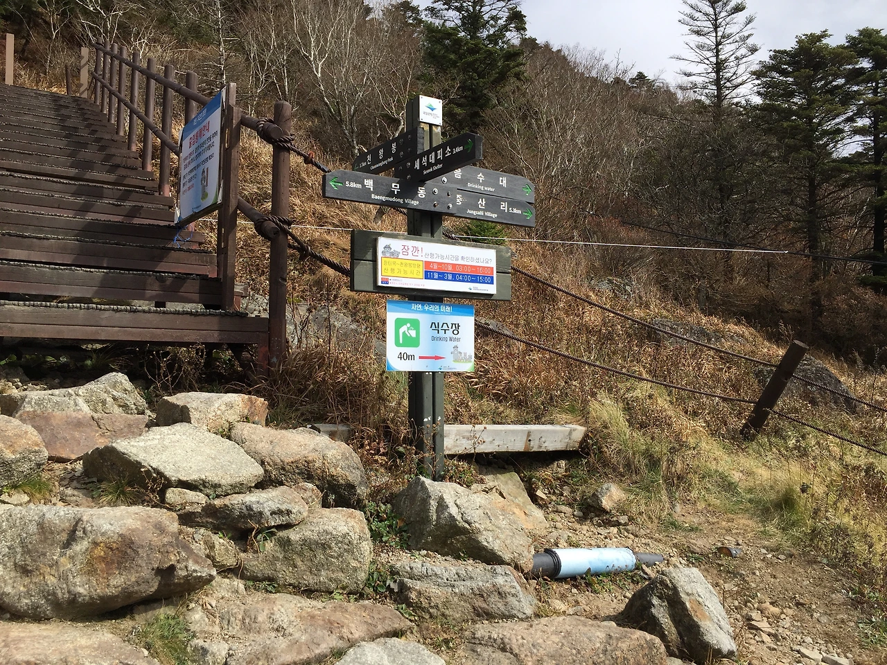 백무동 시외버스 정류장에서 오르막길을 5분 정도 올라가면 백무동 탐방지원센터와 백무동 야영장이 나온다. 등산로의 입구에 두 개의 표지판이 있는데, 하나는 천왕봉과 가장 가까운 대피소가 있는 장터목으로 바로 올라가는 길이다. 다른 하나는 세석 대피소로 가는 길이다. 보통 백무동 코스라고 하면 장터목으로 바로 가는 코스를 말한다. 세석평전으로 올라가는 길은 코스가 너무 길어 당일치기로는 무리다. 백무동탐방지원센터 ~ 소지봉 (3km, 약 2시간) 작은 개울 옆으로 나있는 돌계단길을 오르고 또 오르면 이 개울의 발원지인 참샘이 나온다. 캄캄한 밤에 앞서 올라가며 대화를 나누는 60대 아버지와 20대 따님이 있었다. 대화가 참 재미있었다. 따님이 얼굴 화장을 하지 않고 외출했단다. 마침 비가 왔다. 한 고등학교 남학생이 친구들에게 비가 와도 화장이 지워지지 않는 방수 화장(water proof)을 했다고 화장에 대하여 아는 체하더라는 이야기였다. 따님의 청량한 웃음과 맑은 목소리가 기억에 남는다.