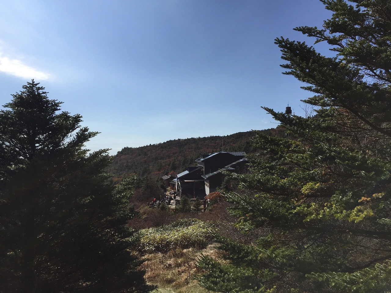 마침내 해발 1,670m의 장터목이다. 장터목 대피소에는 취사장, 야외 긴 의자, 매점, 화장실, 샘터 등이 있다. 천왕봉 올라가는 출발점이다. 경남 산청군 지역을 비롯해서 경남 남부 지역과 남해 바다를 바라볼 수 있다고 하나, 구름에 가려 보지 못했다.