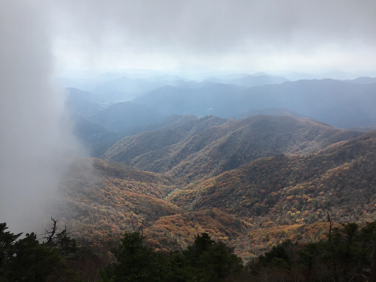 천왕봉 정상 부근의 날씨는 변화무쌍했다. 구름 속을 걷다가 때로는 구름 위를 걷는가 싶었다. 바로 머리 위 눈앞의 구름이 뭉쳐 비를 눈앞에서 만들어 내었다. 발 앞에 비로 뚝뚝 떨어지는 진기한 체험을 하였다. 발아래 계곡에 구름이 수직으로 세워져 좌에서 우로 단체 군무로 진군하듯이 이동하였다. 우측의 단풍 광경을 삽시간에 지워 나가고 있었다. 구름이 산등성이를 휘두르고 흘러 순식간에 계곡을 채웠다.