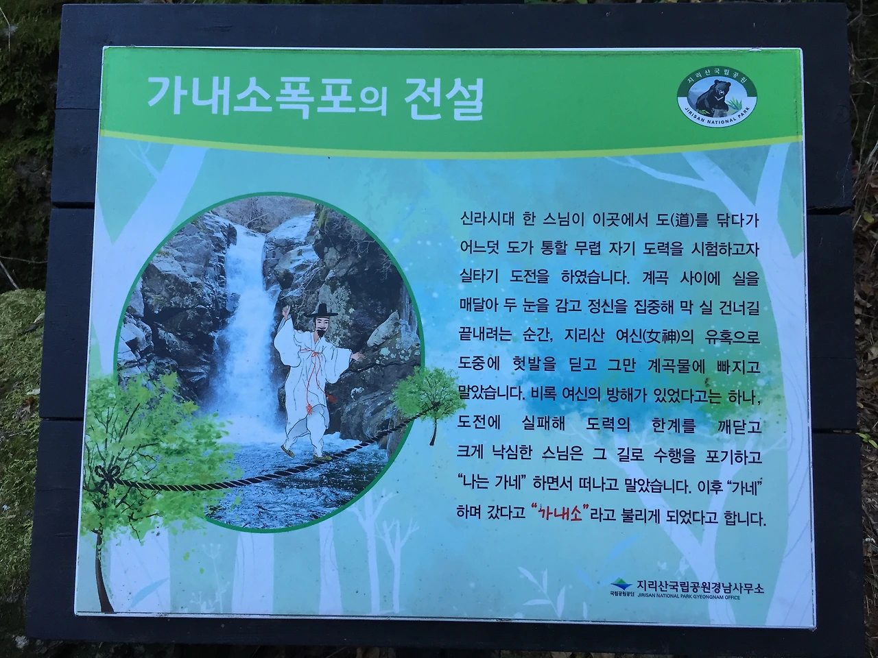 안내간판에 따르면, 신라시대 한 스님이 이곳에서 도를 닦다가 어느덧 도가 통할 무렵 자기 도력을 시험하고자 실 타기 도전을 하였다. 계곡 사이에 실을 매달아 두 눈을 감고 정신을 집중해 막 실 건너기를 끝내려는 순간, 지리산 여신의 유혹으로 도중에 헛발을 딛고 그만 계곡물에 빠지고 말았다.