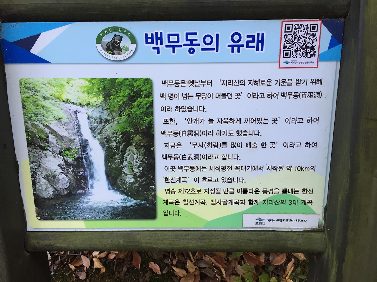 백무동 유래 (3가지 한자 지명)의 간판이 있다. 천령지(天嶺志)에서는 안개가 춤추는 신선이 사는 마을, 白霧洞이란 이름이다. 현재의 白武洞은 1914년 행정개편에 따라 지어진 이름이다.