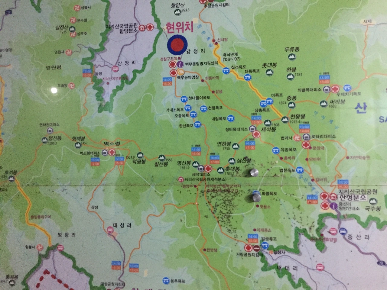 3) 보행수는 약 35,000보. 체력 저하 및 하체 장딴지 옆구리 쪽의 통증으로 지연되어 약 14시간(03:40경 백무동 등산로 출발~17:40분경 백무동 버스정류장에 도착) 소요. 특히 세석 대피소에서 백무동 방향 한신계곡 하산길에서 다리 근육 통증으로 많은 시간이 걸렸다.