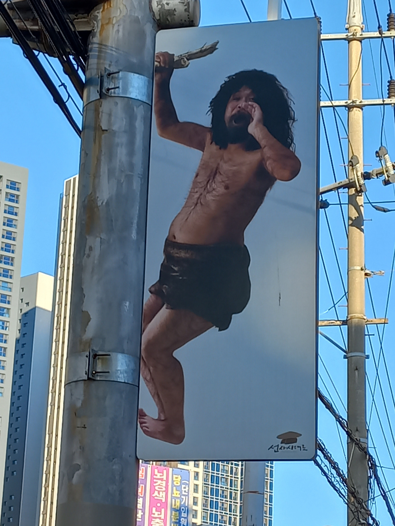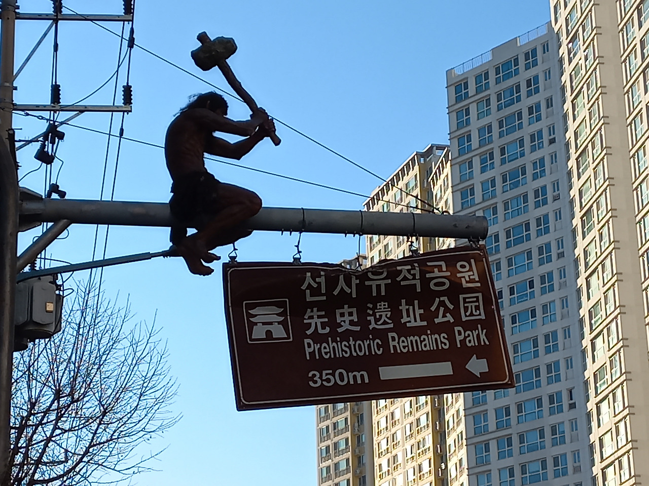 진천역 주변 일대는 선사시대 고인돌과 원시인 아저씨들이 유명했다. 전봇대를 기어오르는 아저씨, 멧돼지 잡기 위해 돌망치로 내리치는 아저씨들이 도처에 있었다. 선사시대 역사 유적 공원 안내 표지판이 돌망치에 맞아 찌그러져 있었다. 관광객 얼굴에 미소를 짓게 만든다.