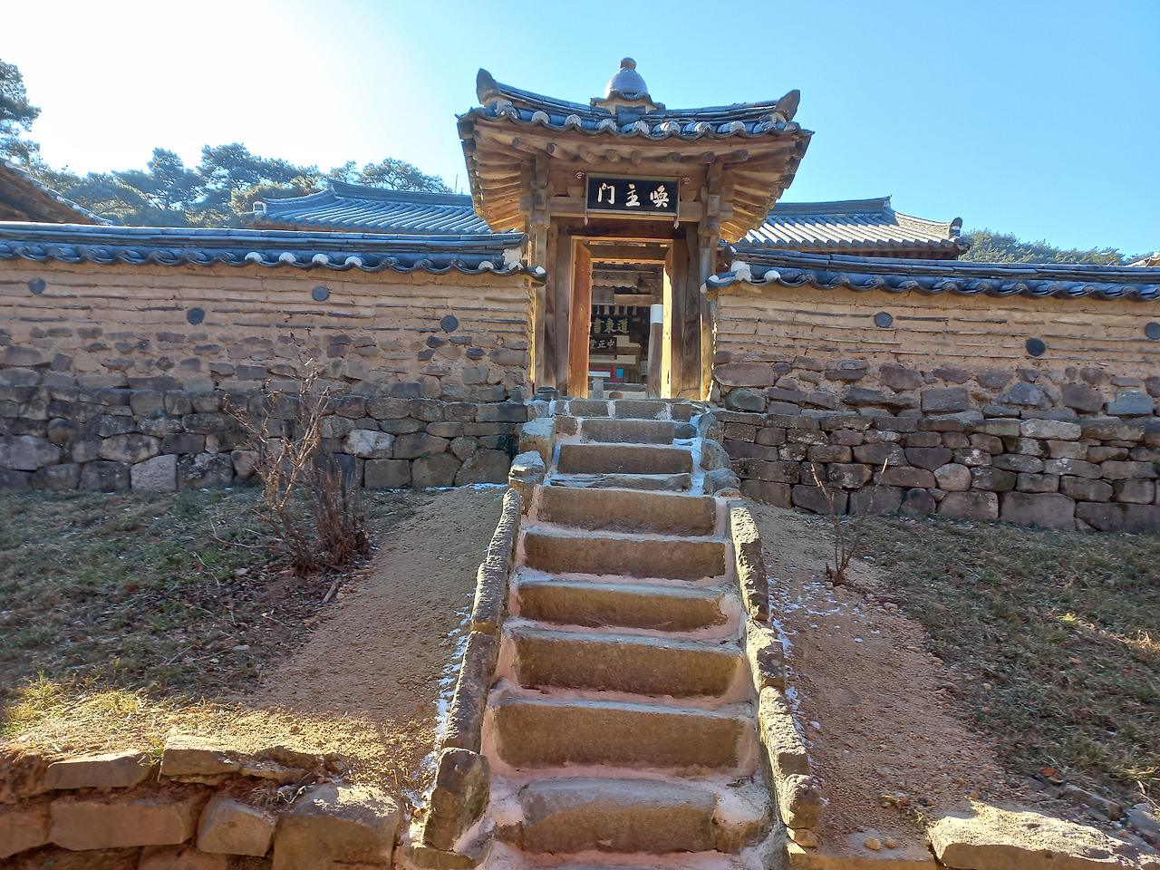 사당입구 문이다. 가운데 작은 문은 신문(神門)이라고 해서 들어가면 안 된다고 한다. 입구의 양두석은 양머리 모양으로 악귀를 쫓는다는 의미로 처용의 탈을 닮았다고 한다. 평소에는 문이 잠겨 있다.