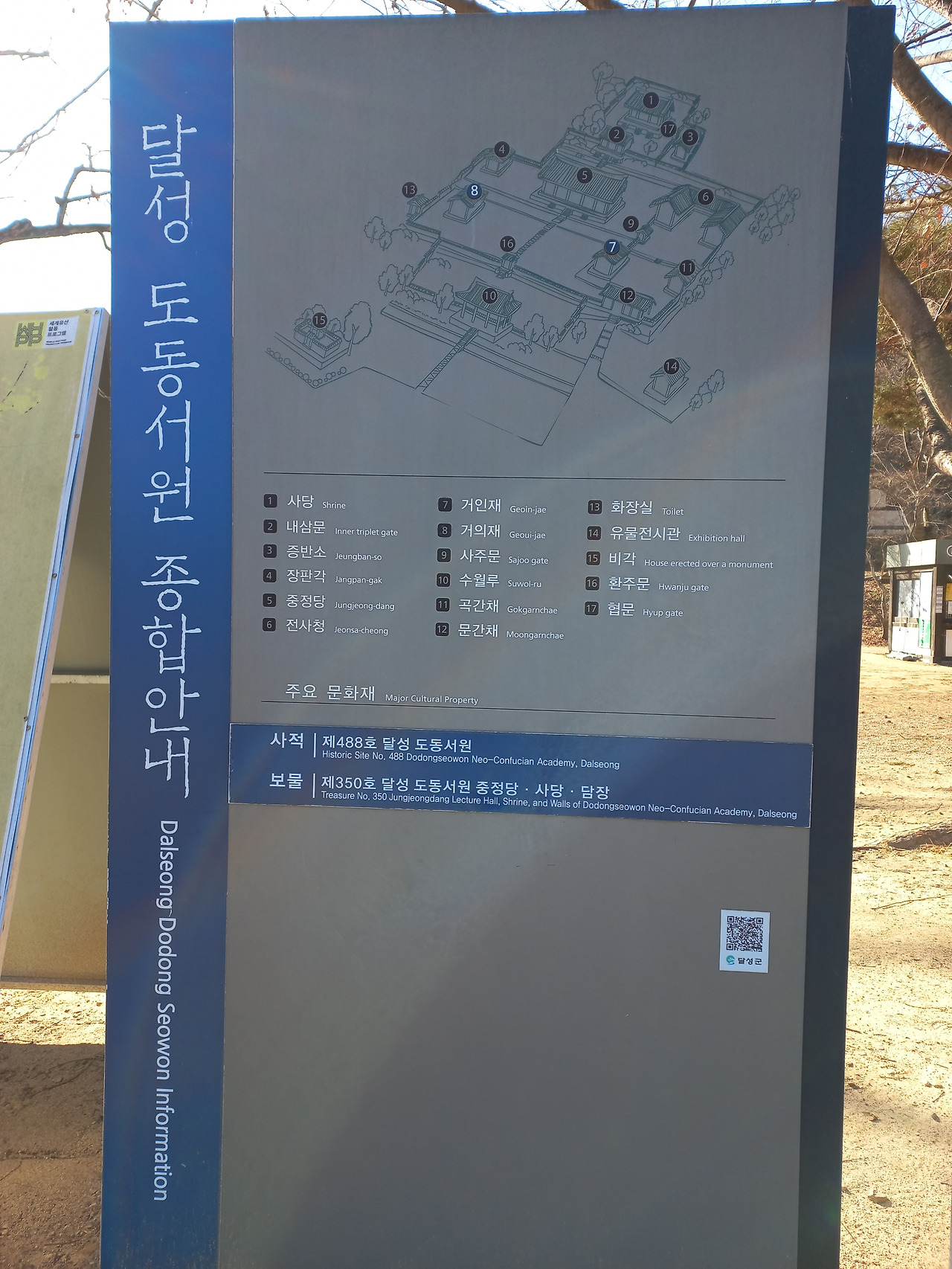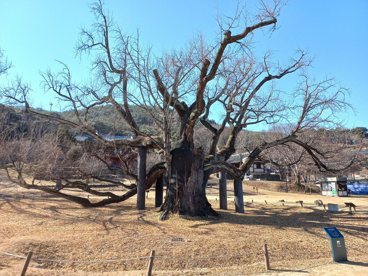 서원 입구에 있는 수령(樹齡) 400년 이상 된 은행나무(보호수로 1982년 10월 29일 지정, 높이 25m, 둘레는 어른 여섯이 두 팔 벌려야 안을 수 있음)는 1607년(선조 40)에 안동부사로 재직 중인 김굉필의 외증손이며, 퇴계 이황(李滉) 선생의 고제(高弟)인 한강(寒岡) 정구(鄭逑1543~1620)가 도동서원 중건기념으로 식수한 것으로 전해지고 있다. 고제(高弟)는 고족제자(高足弟子)의 준말로 ‘학문이나 덕행이 뛰어난 제자’를 일컫는다. 겨울이라 노란 은행잎을 다 떨구고 기둥과 줄기 잔가지만 드러낸 거대한 고목이 누워 쉬고 있었다. 할 일을 다 한 노년의 모습을 닮았다.