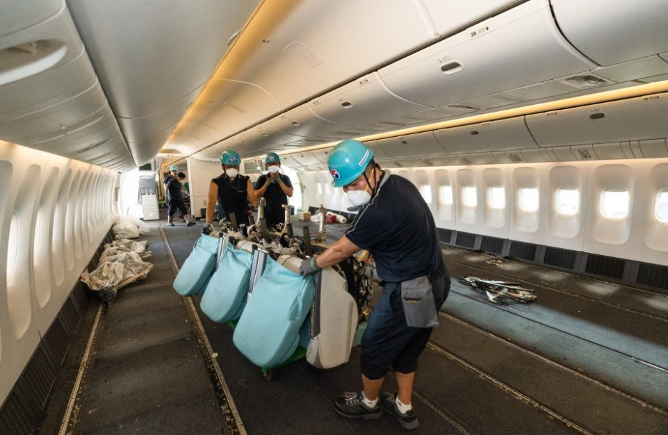 지난 9월 대한항공은 보잉 777의 객실 좌석과 기내 전기배선을 제거했다. 대신 화물을 고정할 수 있도록 바닥에 잠금장치를 설치했다. 항공기 하단에 위치한 적재 공간에 약 22톤의 화물을 실을 수 있는데 여기에 객실 좌석 269석(프레스티지 42석, 이코노미 227석)의 상단 공간을 추가로 확보하면서 11톤의 화물을 더 실을 수 있게 됐다. 여객기가 화물기로탈바꿈하는 순간이다.