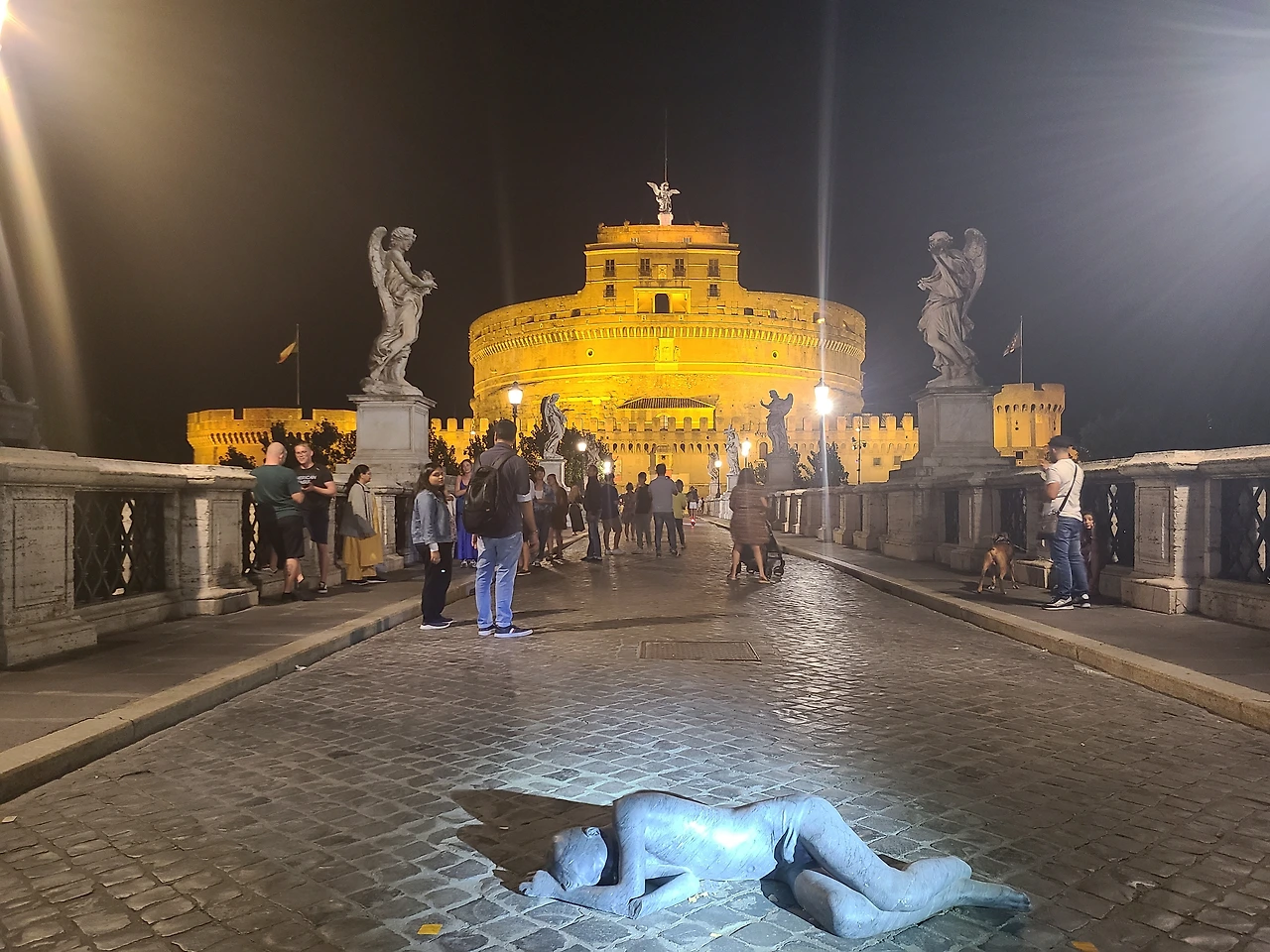 바티칸으로 넘어가는 성천사의 다리. 9월 중순 방문만 해도 중국인 현대미술가의 작품이 설치되어 있었다. 바로 저 누워있는 고대노예의 모습이다. 너무 괴로워하는 자세로 얼굴은 가리고 있는데 로마와 바티칸에서 고대를 거쳐 중세, 그리고 르네상스의 영광의 흔적만 보던 필자가 급격하게 충격을 받은 대목이다.