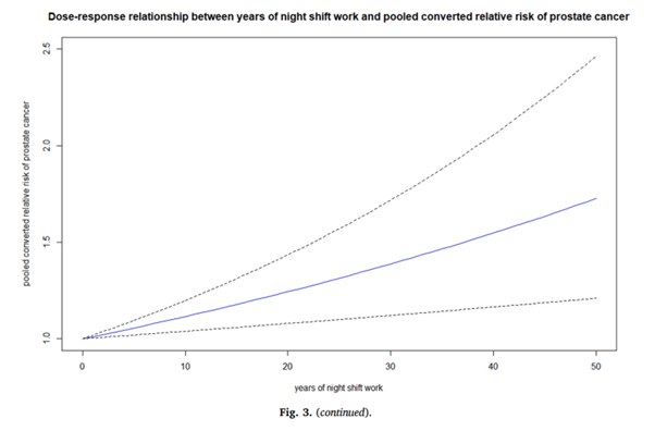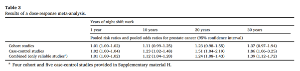 전립선암의 경우, 코호트 연구의 경우 근거 합성시 10년 야간 교대 근무 종사한 경우 11% 위험비 증가, 20년 종사하면 23% 증가, 30년 종사하면 37% 증가한다. 환자-대조군 연구의 경우 근거 합성시 10년 야간 교대 근무 종사한 경우 23%, 20년 종사하면 51% 증가, 30년 종사하면 86% 오즈비가 증가합니다.