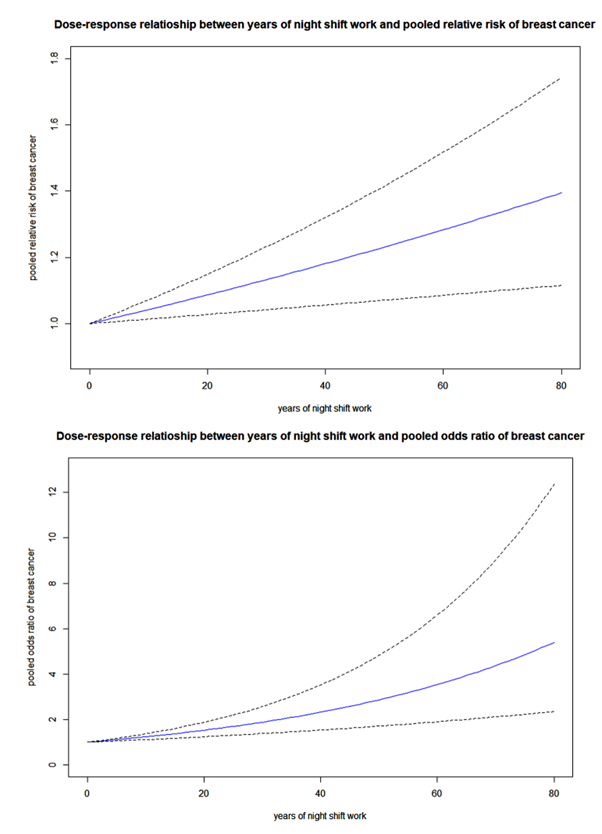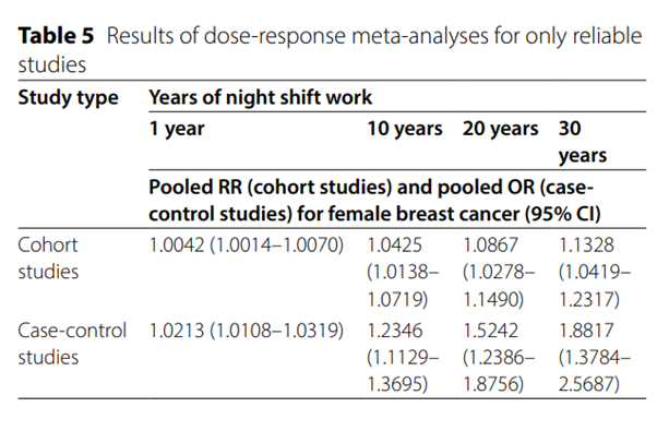 유방암의 경우, 코호트 연구의 경우 근거 합성시 10년 야간 교대 근무 종사한 경우 4.2% 위험비 증가, 20년 종사하면 8.67% 증가, 30년 종사하면 13.28% 증가한다. 환자-대조군 연구의 경우 근거 합성시 10년 야간 교대 근무 종사한 경우 23.46%, 20년 종사하면 52.42% 증가, 30년 종사하면 88.17% 오즈비가 증가합니다.