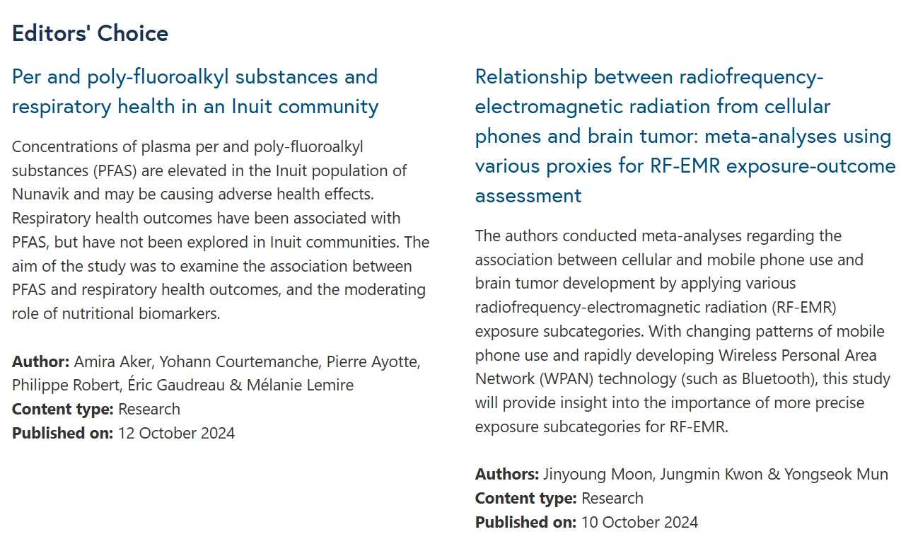 안녕하세요. 제가 2024년 10월에 Environmental Helath 저널에 출판한 휴대폰 전자파의 뇌종양 유발 위험 논문이 편집자 픽으로 (Editor's Pick) 저널 홈페이지 대문에 실렸습니다. 두 편이 대문에 걸리는데, 개인적으로 매우 기뻐서 브런치에 올려봅니다.