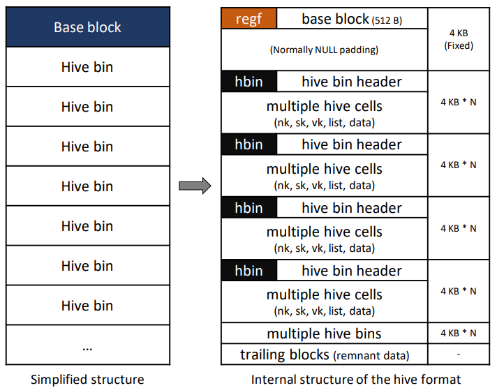 Hive 파일 = 기본 블록(base block) (512B = 4KiB) + 여러 하이브 빈(Hive Bins)
