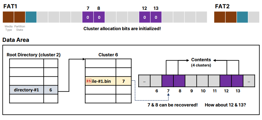 파일 삭제 과정에서는 디렉토리 엔트리의 첫 번째 문자가 0xE5로 변경되며, FAT 테이블의 클러스터 할당 비트가 초기화된다.