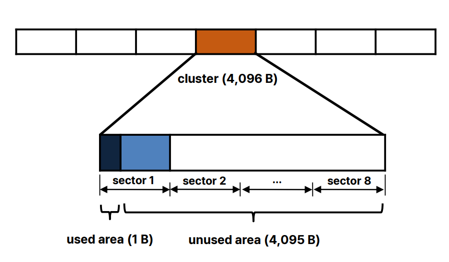 데이터 I/O 효율성과 공간 낭비는 종종 트레이드오프 관계에 있다. 예를 들어, 1 바이트의 데이터를 저장하기 위해 4 KiB의 공간을 할당할 수 있다. 이 경우, 실제로 사용된 1 바이트 외에 나머지 4,095 바이트는 미사용 상태로 남게 되는데, 이처럼 고정 길이 할당 단위로 인해 발생하는 낭비된 공간을 슬랙 공간(Slack Space)이라고 한다.