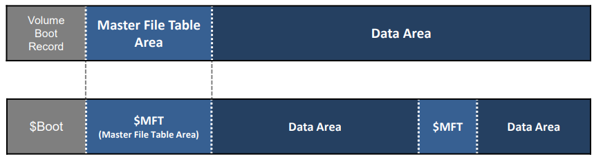 MFT (Master File Table) 영역 : 파일 및 디렉토리의 메타데이터를 저장하는 특수 구조인 MFT 레코드로 구성된 영역이다. 파일 수가 증가함에 따라 'MFT' 영역이 '데이터' 영역에 동적으로 할당된다.