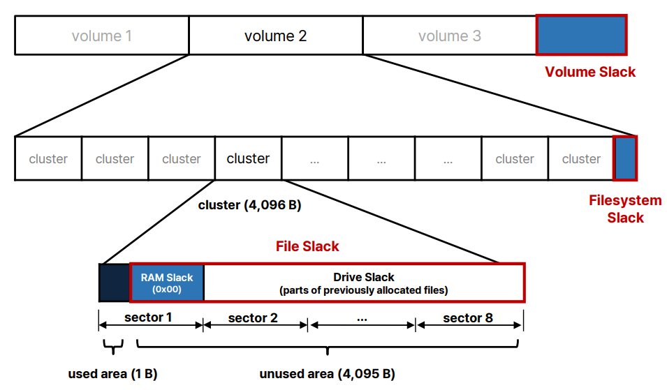 슬랙 공간은 파일 할당 단위와 실제 데이터 크기의 차이로 인해 발생하며, 종류로는 파일 슬랙, RAM 슬랙, 드라이브 슬랙, 볼륨 슬랙 등이 있다.
