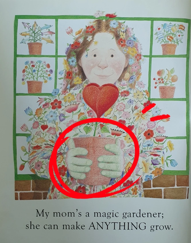 절반에 가까운 영국인들이 취미로 시간을 쏟는 것이 가드닝이기에 앤서니 브라운도 엄마를 표현하는 하나의 장면으로 기꺼이 정원 가꾸기를 넣었을 거다. 그런데 뭔가 이상한 점이 있다. 엄마의 손이 바로 초록색인 거다. 아이들은 이 부분을 보고 "줄기를 다듬다가 식물 즙이 손에 묻어서 그렇다.", "좀비라서 그렇다." 등의 대답을 내놨다. 정답은 뭘까? 앤서니 브라운은 손을 일부러 초록으로 칠했다. 왜냐하면 영국에서 식물을 잘 키우는 사람에게 "You have green fingers"라는 표현을 쓰기 때문이다.