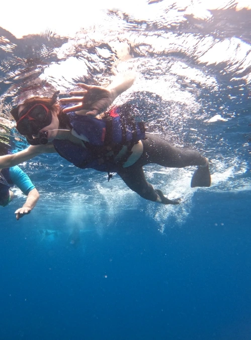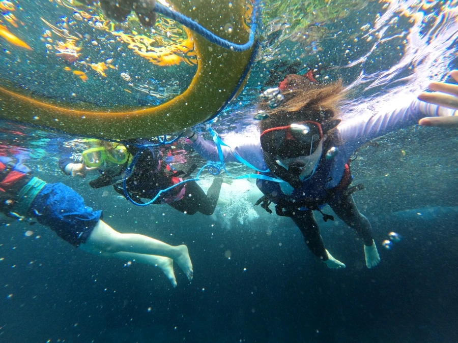 이곳은 잔잔하기는 했으나 여전히 깊어 보였다. (나는 그전까지 바다의 깊이를 너무 얕잡아봤었다.) 주저하고 있는데 가이드가 나와 아이들, 남편에게 수영할 줄 아냐고 물어봤다. 나는 "수영할 줄 알지만 바다에서 스노클링 하는 건 처음이다."라고 했고 그러면 자기가 튜브를 줄 테니 거기 매달려 있으라고 했다. 그래도 들어가기 무서웠는데 같은 배에 탄 한국인 중년 여성분들도 뛰어들고 있는지라 나도 몸을 물속에 던졌다. 스노클링 호흡법이 익숙지 않아 짠물이 자꾸 입으로 들어오고, 수경엔 계속 습기가 찼다. 바닷물은 또 왜 이리 찬 지... 물고기고 뭐고 그만하고 싶은 마음뿐이었다.
