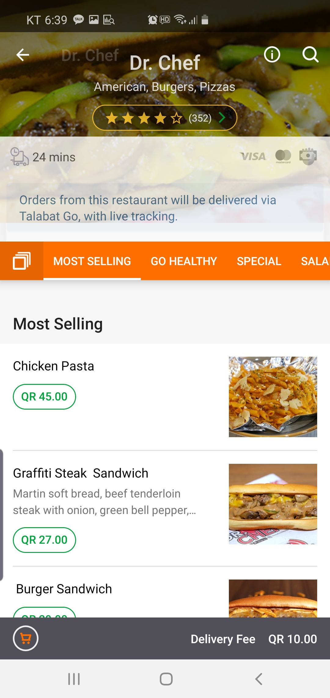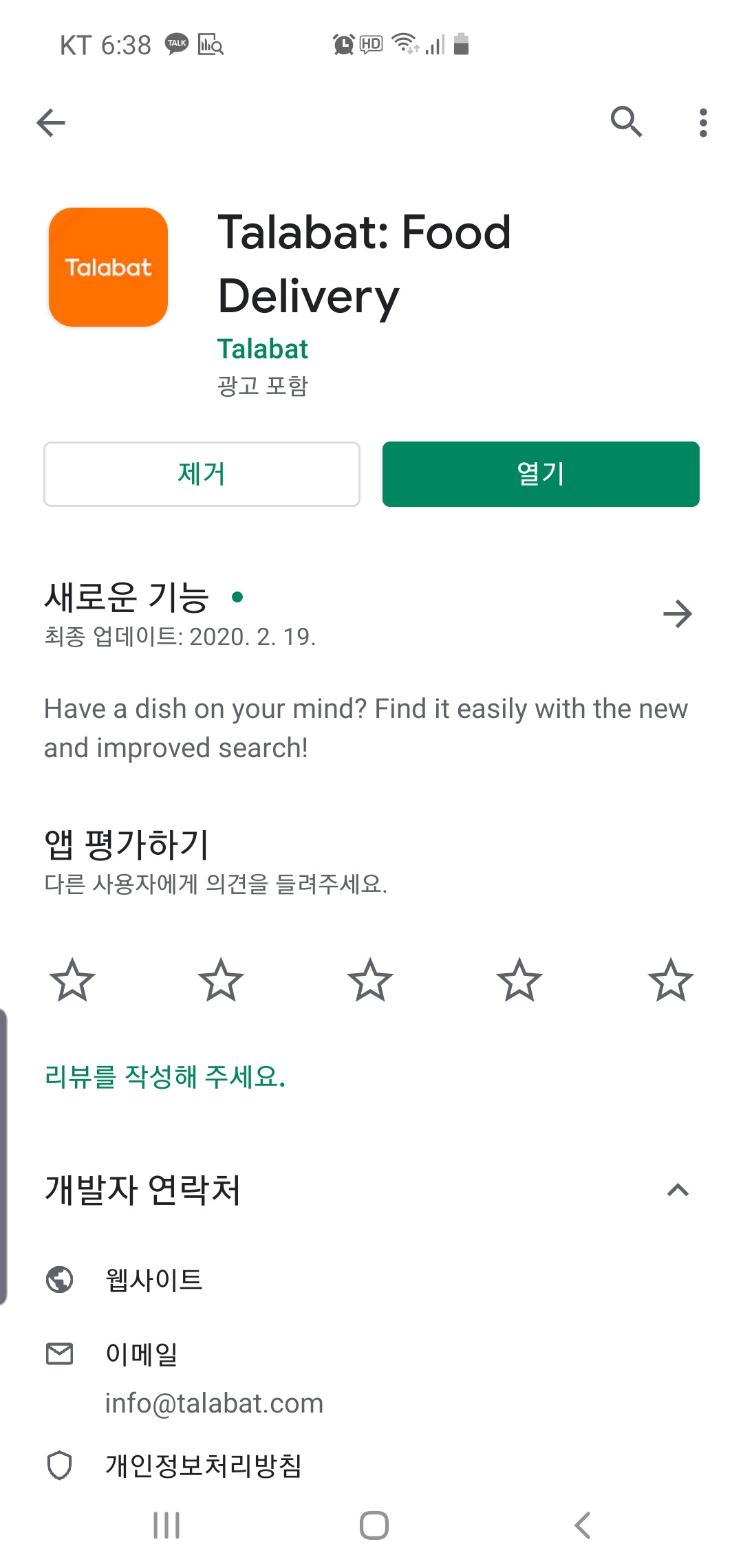 음식 배달에 특화된 앱을 찾으신다면 Talabat이라는 어플도 있어요. 레스토랑에 따라 다르지만 보통 메뉴별 가격과 사진이 올라와 있고, 사용자의 평점도 확인이 가능해요. 또한, 주문 전 배달시간 확인이 가능하고 주문 시작 후 트래킹도 가능해요. 배달료는 5-10 QAR 정도고요.