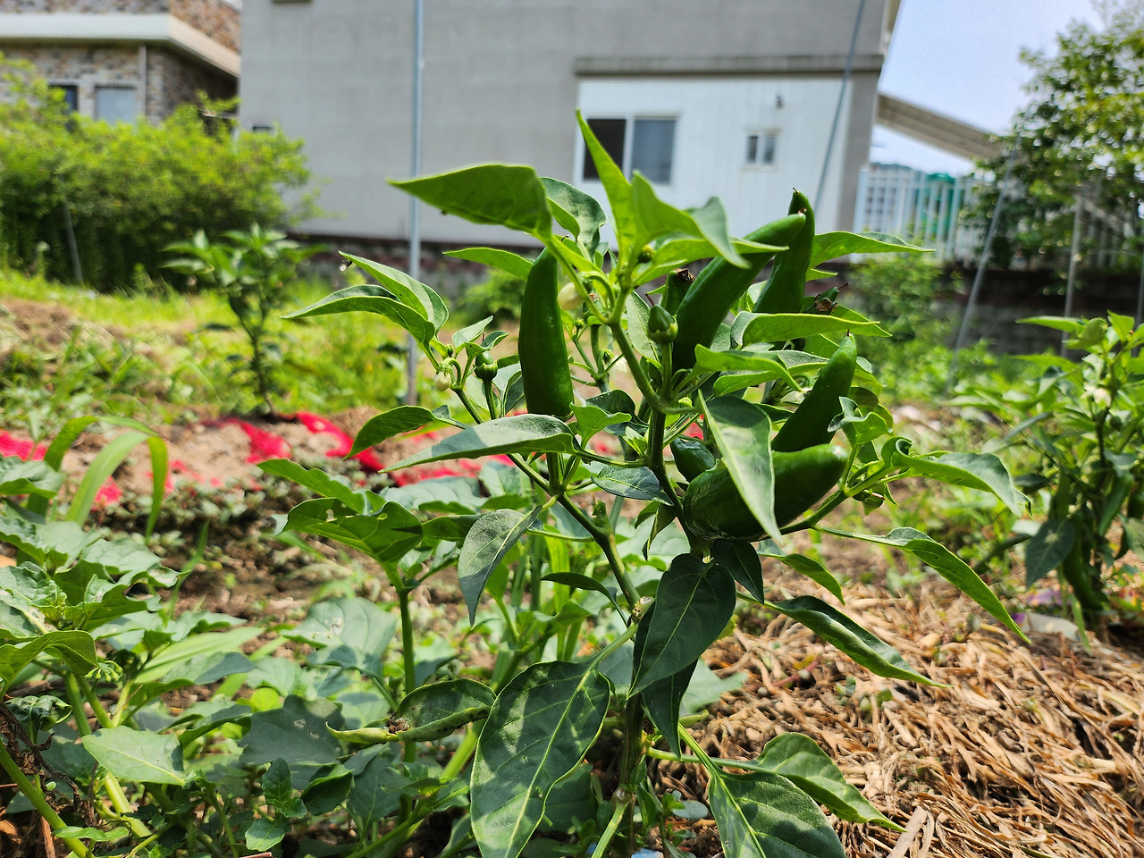 크고 윤기 나며 색이 좋은 고추이고, 맵지만 단맛이 느껴지는 품종이란다. 지금 풋고추를 따먹어야 나중에 맺는 고추가 뒷심을 받아 잘 큰다니 다음을 위해 몇 개씩 따줘야겠다.