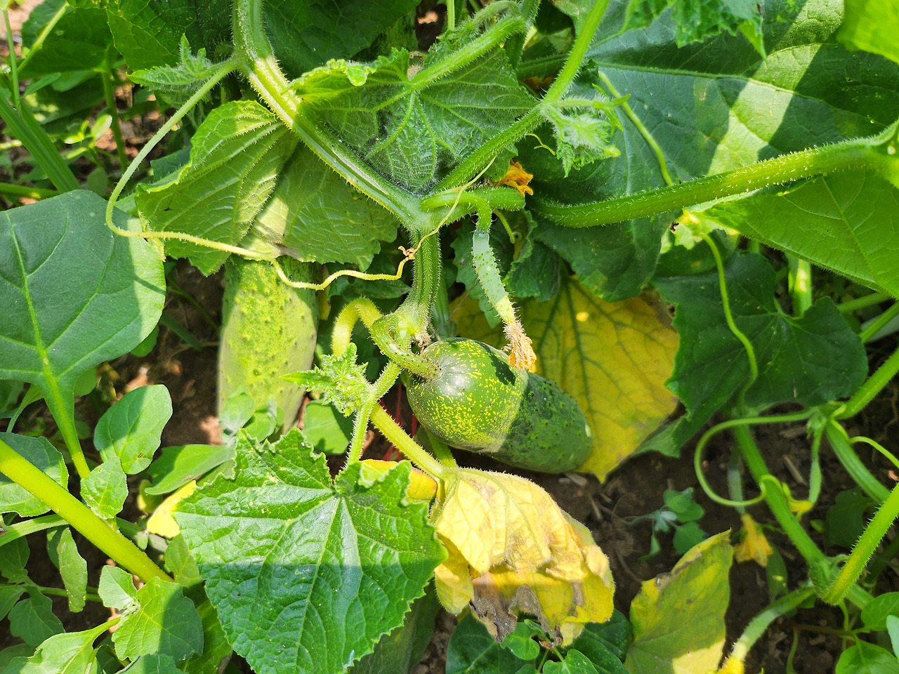 오이 모종 4개를 심어놓았는데 그새 노란 꽃이 떨어지고(꽃이 폈는 줄도 몰랐다) 기다란 오이가 달려 있었다. 한 두 개가 아니라 대략 8개 정도는 수확했다. 정글 같은 밭에 큼직한 오이가 주렁주렁 달려있다니! 오늘 참여한 사람들 모두 놀란 표정이었다.