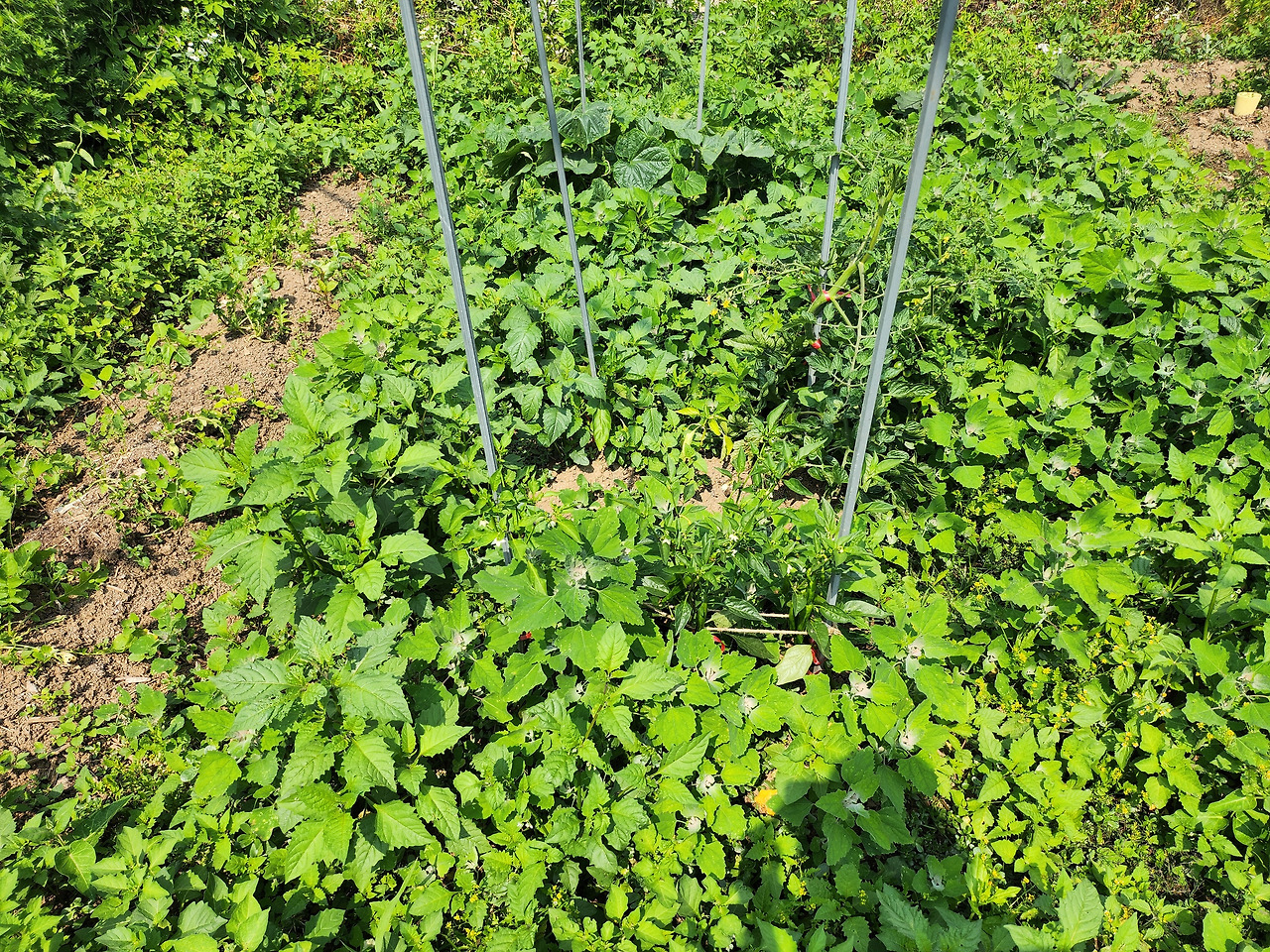지지대를 따라 내가 심은 작물을 겨우 확인했다. 지난번에 빨간 노끈으로 대충 묶어두었는데 누군가 손을 댔는지 빨간 끈은 사라지고 마끈이 보였다. 토마토 곁순도 따줘야 한다고 들었지만 길이 막혀 다가갈 수 없었다. 멀리 보니 초록색 방울토마토가 맺혀있었다.