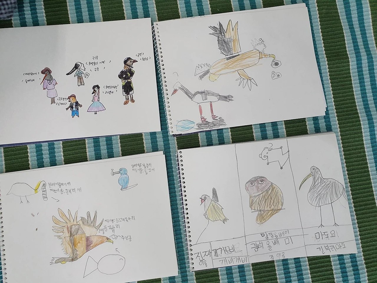 군인 황독수, 화성호의 공주 고니엘라도 나오고요. 금눈쇠 올빼미는 눈이 말똥말똥해서 말똥 올빼미라는 이름을 붙여줬어요. 개개비는 개비개비가 되었죠. 마도요는 긴부리마도라는 별명을 얻었습니다. 물총새는 물꼬새라는 이름이 생겼는데, 부리에 물고기를 물고 있기 때문이죠.