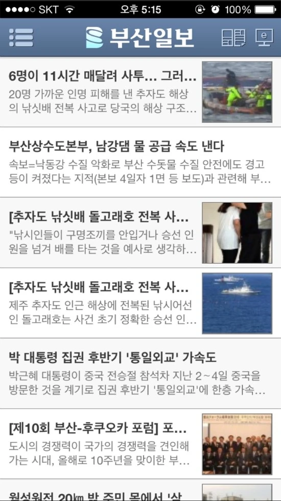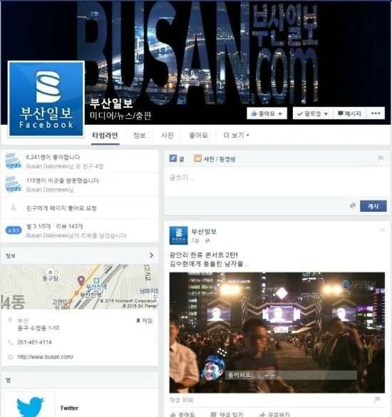 이번엔 페이스북 페이지다. 페이스북이야 말로 최신 뉴스를 가장 발빠르게 접할 수 있는 모바일 플랫폼이다. 언론의 속보성을 채워줄 수 있는 가장 적합한 플랫폼이라 할 수도 있다. 이미 부산에도 많은 시민들이 페이스북을 이용하고 있다. 부산일보 같은 경우에는 2013년 부터 페이스북 페이지를 운영해 오고 있다. 2015년 9월 10일을 기준으로 6,250명이 좋아요를 누르고 구독중이다. 초창기에는 뉴스지면을 그대로 따와서 퍼나르기 식으로 진행하다가 전략을 바꾸고 페이스북에 뉴스 컨텐츠를 직접 게제하고 링크를 걸기 시작했다. 최근에는 인터렉티브 뉴스와 재미있는 컨텐츠를 만들기 위해 고군분투 중이다. 그런데도 올라오는 컨텐츠의 이미지들은 아직도 촌스럽다는 인상을 지울수가 없다. 다행히도 가장 최근에 진행 중인 프로젝트 뉴스들은 아주 깔끔하다!
