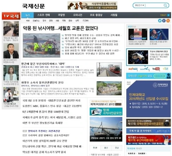 국제신문은 부산일보에 비해 그나마 잘 정돈된 느낌이다. 일단 배너 거의광고가 없다. 글꼴도 부산일보 보다는 가독성이 더 좋은 것 같다. 그럼에도 불구하고 부산일보와 동일한 레이아웃으로 큰 차이가 없다. 아마도 같은 업체에서 제작한 것 같은데, 부산일보와 조금만 차별화를 준다면 더 좋을 것 같다는 느낌이 든다. 한가지 새로운 점은, 언제부터 서비스를 시행했는지 알 수 없지만, TV국제라는 메뉴가 좌측 상단에 생겼다. 4가지 컨텐츠가 선택이 가능한데 뉴스 동영상을 서비스하고 있다. 지역언론에서 뉴스 브리핑을 서비스하는게 조금 신선했다. 하지만 여기자를 이용한 어설픈 뉴스 브리핑 보다는 국제신문만의 특색을 살려 다른 신문사들이 하지않는 동영상 컨텐츠를 제작해서 서비스를 하면 더 좋을 것 같다.