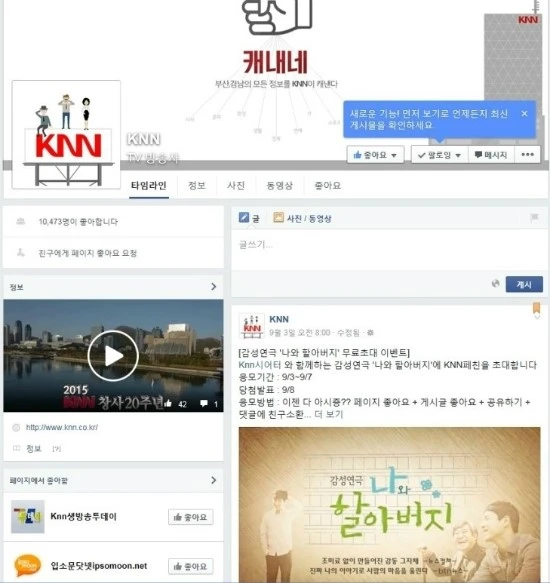 홈페이지 비교에서도 나타났듯이 페이스북 페이지 관리에서도 KNN은 부산일보와 국제신문에 비해 우월함을 나타냈다. 동영상 뉴스를 기반으로 한 컨텐츠를 제작하기 때문에 다양한 컨텐츠 제작이 가능하며, 정보의 신뢰성 면에서도 글보다는 영상이 훨씬 더 크게 다가 온다. 단순한 예를 들어 부산에서 교통사고가 났다는 페이스북 컨텐츠와 교통사고 영상이 담긴 블랙박스 영상을 보여주는 차이는 어마 어마 어마다. 거기에 방송국이라는 다양한 멀티미디어 컨텐츠를 이용해 신문사 보다는 더 재미 있고 가벼운 스낵 컨텐츠도 같이 제공하고 있다. 그 결과 2015년 9월 10일 기준으로 좋아요 구독자수 10,910명을 확보하고 있다.