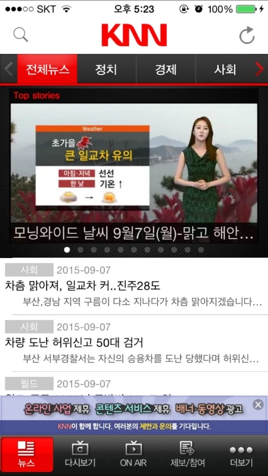 방송사라는 이점이 뉴스앱에서도 역시 적용된다. 동영상의 썸네일을 활용한 이미지 위주의 레이아웃이 시원한 느낌을 준다. 하단에는 KNN 프로그램들을 실시간으로 볼 수 있는 메뉴와 다시보기 메뉴가 있고 제보와 참여 메뉴가 바로 보인다. 전체적으로 깔끔하다.