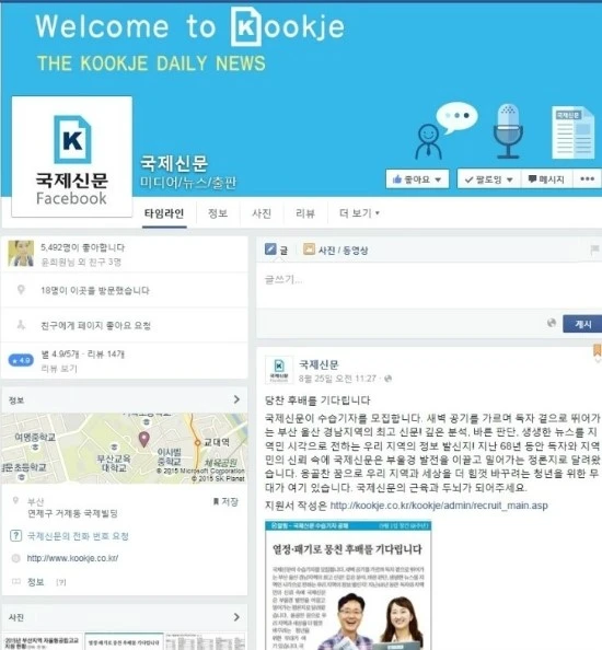 사실 부산의 대표 신문사하면 <부산일보>를 떠올리는데, 홈페이지나 페이스북 운영을 보고 있으면 <국제신문>이 훨씬 잘 되고 있는 것 같다. 물론 1980년 12월 언론기관 통폐합으로 <국제신문>이 부산의 유일한 일간지가 되었지만 부산일보라는 이름이 주는 힘은 여전히 무시할 수 없다. 부산일보 사옥의 위치 또한 부산역 옆에 있기 때문에 부산의 상징처럼 느껴진다고 할까. 여튼 국제신문의 페이스북 페이지는 아주 깔끔하게 운영되고 있는 느낌이 든다. 다만 부산일보는 최근들어 다양한 프로젝트를 진행 중인데 국제신문에 그에 못미치는 느낌이 든다. 전반적으로 깔끔한 레이아웃으로 정리가 잘된 느낌이 들지만 새로운 구독자들을 만들만한 재미있는 콘텐츠는 부족하다는 느낌이든다. 국제신문은 2015년 9월 10일을 기준으로 5,490명의 좋아요 구독자를 가지고 있다. 부산일보의 6,250명에는 약 800명정도 차이가 난다.