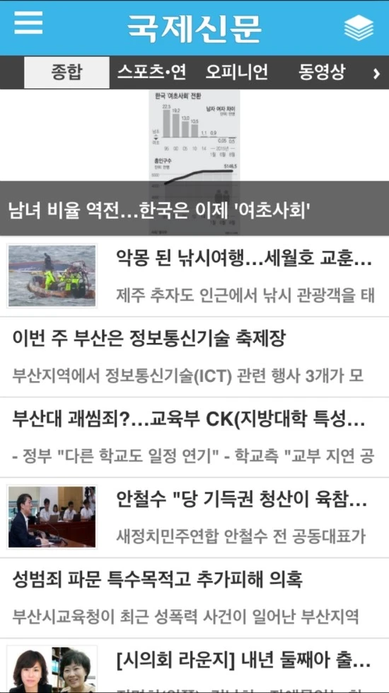 부산일보 뉴스앱 보다는 쪼금(?) 더 낫다. 홈페이지, 페이스북 페이지를 보면서도 계속 느낀 거지만 이상하게 국제신문이 쪼금씩 부산일보 보다 더 앞선다는 느낌이다. 뉴스의 컨텐츠 질을 비교하는 것이 아니라 레이아웃과 운영되는 것을 보면서 느낀 것이다. 물론 개인적인 의견일 수도 있다. 역시나 신문사의 한계를 벗어나지 못하고 글에 편중된 컨텐츠들로 독자들의 호기심을 자극하기 힘들다.