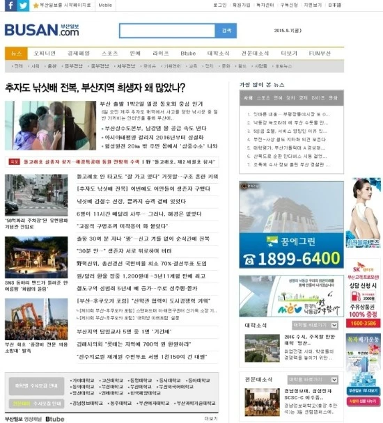 제일 먼저 부산일보의 홈페이지를 찾아 보았다. 부산일보가 언제부터 홈페이지 서비스를 시작했는지 알아보고 싶었는데 알 수가 없다. 찾아보려 했지만 찾기가 힘들다. 첫 화면에 들어가면 느낀 것은 요즘 트렌드에 역행하는 레이아웃이라는 것이다. 마치 인터넷 초창기에 만들어진 듯한 레이아웃이다. 초기 홈페이지를 개선하지 않고 계속 사용하고 있는 것 같다. 부산의 대표 신문사라고 하기엔 너무나도 부족한 홈페이지다. 지역 대표 언론사라는 타이틀을 내새우기엔 부산의 지역색을 찾아볼 만한 요소도 찾기가 힘들다. 홈페이지를 보고 있으면, 종이신문에서 광고수익을 내고 있으니 홈페이지 무료뉴스는 아무렇게나 관리해도 상관없다는 듯한 인상을 준다. 네이버 스탠다드 뉴스에 집중하는 것도 좋지만 메인 홈페이지가 조금만 더 쌈박했으면 좋겠다.