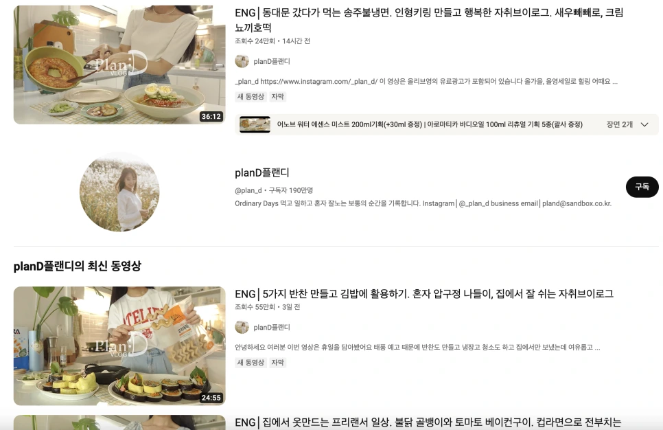 브이로그를 보는 이유는 다양하겠지만, 나에겐 '저렇게 사는 삶도 있구나'를 구경하는 재미가 가장 크다. 한번도 만나본 적 없는 사람들이지만, 그리고 브이로그란 일상의 한 단편일 뿐이지만, 누군가의 라이프스타일을 보는 것은 사람들이 살아가는 이야기에 대한 관심이 늘 많았던 나로선 놓칠 수 없는 콘텐츠다. 그 중 '나도 저렇게 살아보고 싶다' 라는 생각까지 들게 하는 것들은 곧 '최애' 채널이 된다. 오늘 쓴 두 채널이 그렇다. 척하지 않아도 느껴지는 자기만의 스타일 때문인지 그들이 좋다고 하는 것에는 왠지 설득력이 생긴다. 그래서 협찬 광고들이 붙는 것이기도 할테고. 자신이 살아가는 이야기 그 자체만으로 사람들을 구독하게 만드는 건 엄청난 힘같다.