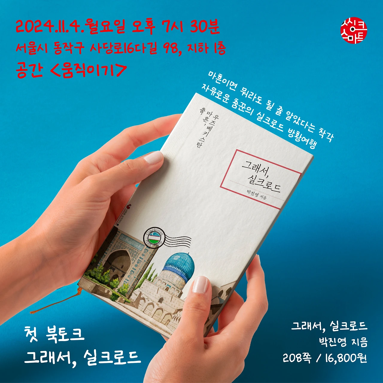 저의 첫 책 <그래서, 실크로드> 출간을 기념하여, 자그마한 다과회(북토크)를 진행할 예정입니다. 대략적으로 책 내용 소개와 경험 나누기, 질문 및 답변 형식으로 이루어질 것 같습니다만, 인생의 첫 북토크라서, 수집된 정보가 전혀 없어서 실제로 어찌 될지 솔직히 잘 모르겠습니다. 생각하면 울렁거립니다. 안그래도 언어구사력이 좋지 못한데다가, 두 사람 이상 앞에서 말할 때는 너무너무 떨리는데 말이지요. 분명 많이 어버버 거리겠지만, 그래도 마음으로 깊이 응원해주시는 분들의 범 기운을 받아서 용기있게 내던져 보렵니다.