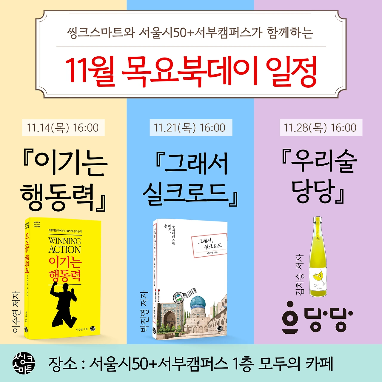 <그래서, 실크로드> 책 출간 첫 번째 북토크를 마치고, 이제 11월 21일 오후 4시 서울시 50+ 서부캠퍼스 1층 카페에서 두 번째 만남을 갖게 되었습니다. 춤 이야기에 아주 짤막한 미니특강도 곁들일 예정이에요. 어떤 만남의 자리가 될지, 저는 또 어떤 당혹과 혼돈의 상태에 빠져서 어떤 말을 하게 될런지 긴장되고 떨립니다. (지난번 북토크때도 무슨 말을 했는지 기억이 조각조각 파편화되어 있습니다;) 하지만 삶의 펼쳐짐속에 내던지고 내맡기는 중입니다. 그리고 또 그 과정에서 조금씩 깨닫고 변화되어가는 중입니다. 혹시 시간이 되셔서 잠시 들러주신다면, 참 감사하겠습니다.