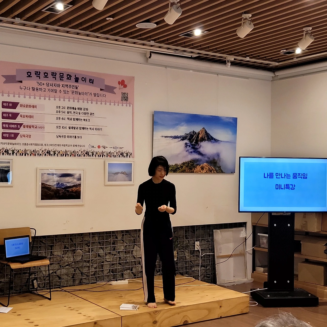 편집장님의 도움으로 북토크 진행 순서와 큰 틀을 잡았지만, 북토크를 얼마 앞두고도 전달내용과 형식에 대해서는 여전히 어느정도 답이랄만할 것이 손에 쥐어지지 않았다. 내가 특히 염려했던 부분은 <움직임 미니 특강> 이었다. 저자의 이야기를 들으러 북토크에 오신 중장년층의 청중분들이 과연 "부담스러운" 춤을 추려고 하실까? 의자에 앉아계시는 청중분들이 과연 자리에서 일어나서 움직이려고 하실까? 부담스럽고 난처하다는 표정들, 미적지근한 반응들, 나 혼자 수업하고 나 혼자 춤추는 최악의 상황이 머릿속에 그려지는 거였다.