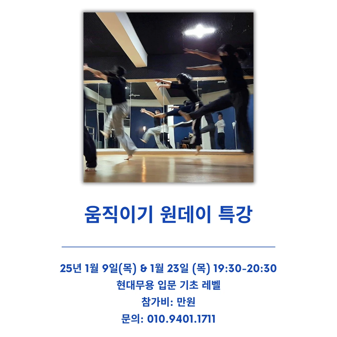 1월 23일 목요일 저녁 7시 30분에 원데이 특강이 또 한번 있습니다. 그동안 춤을 춰오면서 발견하고 일구어온 소중한 가치들을 많은 분들과 나눠보고 싶습니다. 물론 그것은 저만의 매우 사적이고 주관적인 가치일테지만, 저의 존재와 저의 삶 전반에 걸쳐 가장 큰 영감이 되어준 춤, 그 가치의 힘을 믿습니다. 춤이 저에게 그랬듯이, 여러분에게도 존재와 삶으로 뛰어들어오는 춤이 되었으면 좋겠습니다.