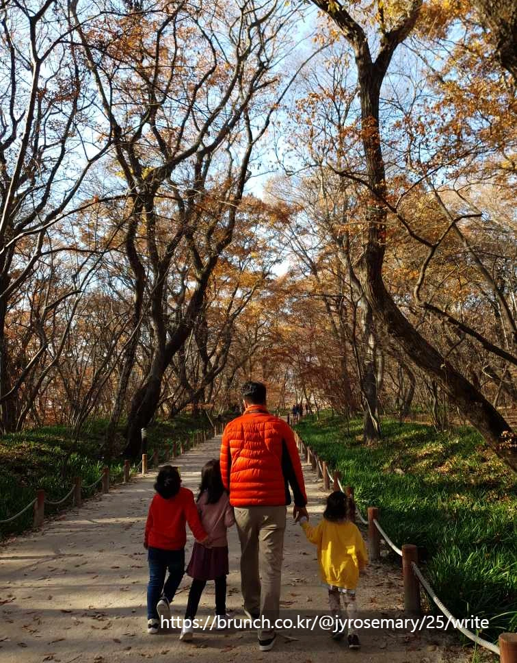 첫째 아이가 7살쯤 되었을까. 남편이 세 아이들과 함께 가을 숲길을 걸어가는 모습이다.