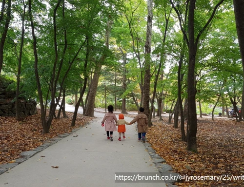 가을 숲길처럼 알록달록한 뒷모습을 보고 있으니 기분이 좋아진다. 내 전부인 이들.
