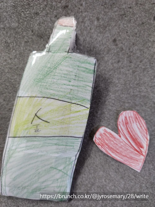 술병만 있었다면 허전했을 텐데 아이의 센스로 빨간 하트가 더해지니 나름 선물 같았다.