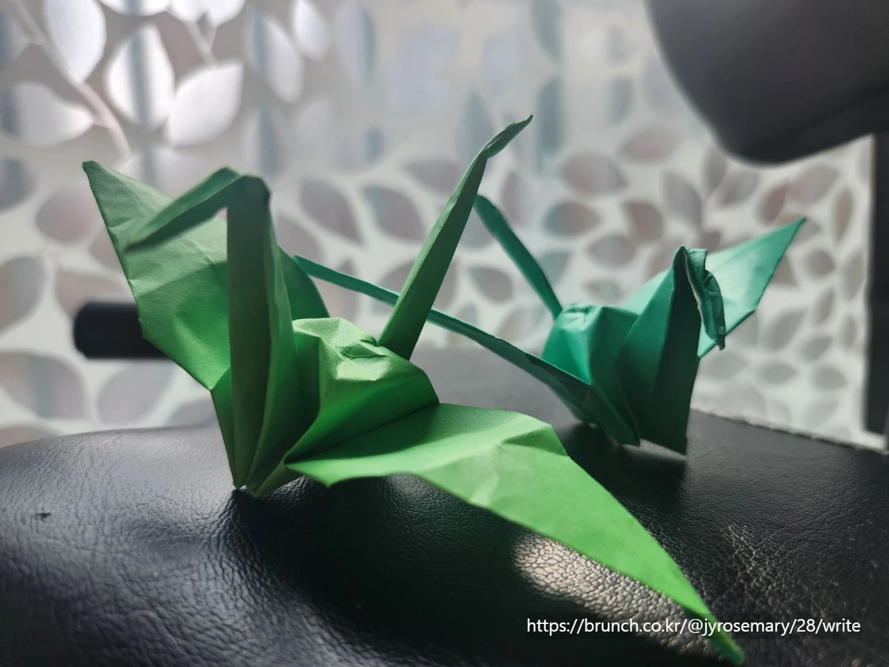 둘째 아이가 아빠에게 선물한 초록색 학 두 마리는 언젠가 날아오를까.